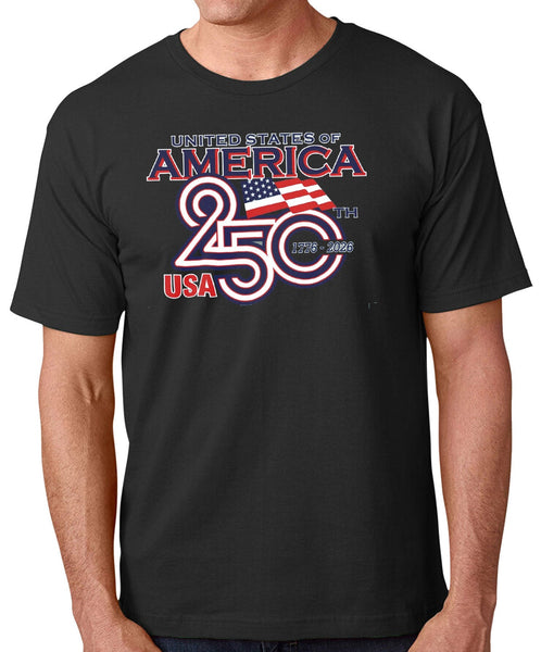 The bold graphic features “United States of America,” “USA,” and a “250” with a swirl motif, creating a visually dynamic design that commands attention. Perfect for parades, family gatherings, patriotic events, or everyday wear, this tee lets you show your pride in style.