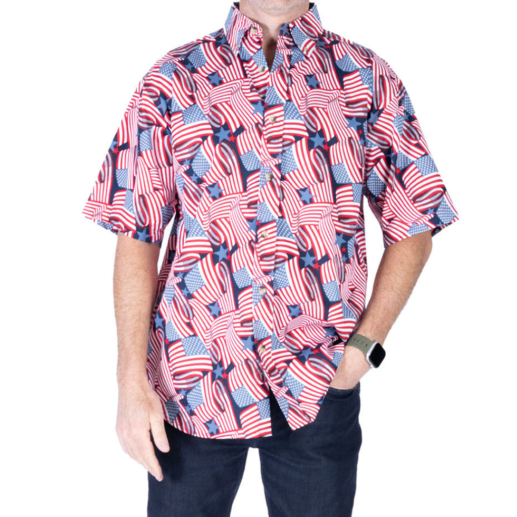 We offer a diverse selection of styles to fit your needs when shopping for an American flag button-up shirt. When choosing this type of patriotic apparel, the matter of sleeve length is important to getting the right choice for you. When looking for a button up that lets you keep cool this summer, check out our short sleeved or even sleeveless options for a look that is summer ready. Available in a range of knits and materials to get the right choice for your intended activities and preferences, these options are perfect for pairing with your favorite jeans or khakis for a look that shows your pride in your country. Choose from a variety of American Flag patriotic button up shirts with long sleeves which allow you to show your pride in the Red, White, and Blue during colder months of the year. From our classic American flag woven shirt to our USA themed Declaration of Independence shirt, you can't go wrong when trying to have a clean look while showing off your patriotism. Regardless of which style is right for you, rest assured that every option is well made with high-quality materials designed for comfort and longevity in their wear. Made with attention to detail to ensure a great value, these options are the perfect addition to your wardrobe while meeting all of your high standards. When shopping for an American flag button-down shirt, find your new look right here with these great options!